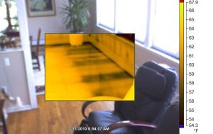 Here’s at thermal image of an overhand section of my living room floor. The dark patches are colder, much colder, than the rest of the floor. The insulation contractor blew insulation into the cavity improperly so barely any insulation went in, leaving big gaps between the floor and the insulation. Unfortunately, I didn’t discover this until I bought my thermal camera and had finished residing my house, so there is no simple fix. Argh!!!