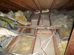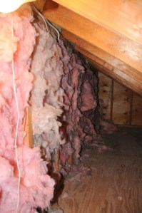 But before you dive into it and add lots of insulation, you’ll want to study up on air infiltration and sealing. You’ll find out that air sealing is crucial before you insulate or you might even cause problems by adding insulation. On the other hand, if you go into your attic and you see big areas missing insulation like shown in this picture, you should immediately fix it. Usually, you’ll find the missing insulation sitting in a pile next to the bare spot, right where the electrician or carpenter left it after doing work in the attic. Just replace it, making sure that the insulation rests firmly against the ceiling below. Any air gaps will seriously compromise the ability of the insulation to do its work.