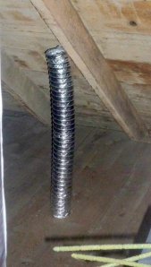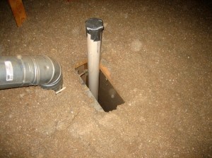 Remember, we’re trying to make that balloon air tight, so we have to find all those holes where air and moisture are escaping into the attic. If you look around your attic, you’ll probably find some pipes sticking up through the insulation and going out the roof. Or, sometimes, like in this photo, they’re part of some other system. Unfortunately, they represent big holes in your attic that allow air and moisture to travel through the walls and into the attic. And, since they’re usually located in the bathroom wall where the humidity is high, the super-high humidity shower air often goes right into the wall and up to the attic. Worse, they often share a wall cavity with water pipes which can lead to frozen pipes and serious water damage.