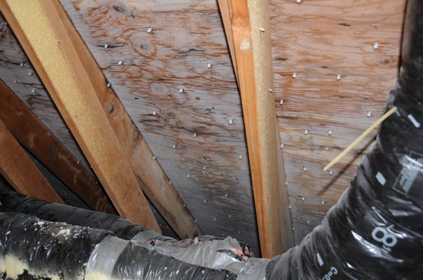 Frost on the roof in the attic Published December 20, 2011 at 1024 × 680 in Attic insulation problems and solutions – Part 2 Frost on the underside of the roof Icy roof deck caused by cold surface and excess humidity. Dead air space behind knee wall with air leaks from house into the space.