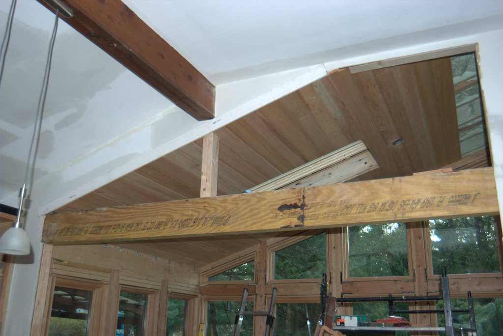 All too often, a T&G ceiling is constructed in a way that virtually guarantees water problems. The roof is installed over the rafters. Fiberglass is shoved between the rafters. T&G boards are nailed to the rafters. Bingo – you get mold, water “leaks”, and thousands of dollars of repairs which probably don’t even fix the problem.