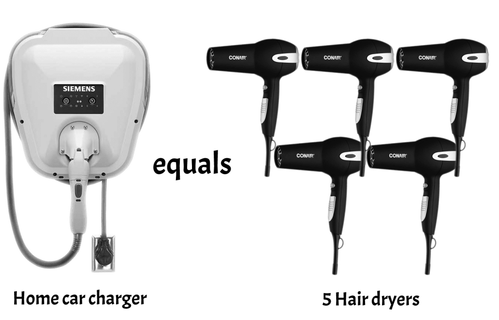 Another appliance that makes a good comparison is your home’s central air conditioner. A typical, mid-sized (4-ton or 48,000 BTUs/hr) air conditioner uses ~4,000W, so charging the car is like running a bit less than two central AC systems. A water heater is usually 4,500W-5,500W, so the car is pulling more than the water heater too!